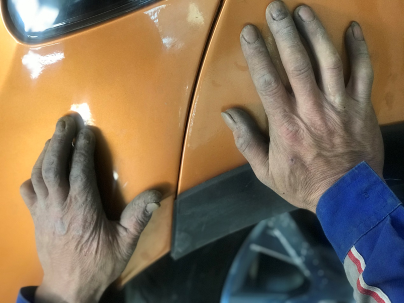 這是物產汽貿公司青年鈑金技師在進行車輛維修作業時所拍,凝視鏡頭中凝聚了勤勞和汗水的雙手。這雙手是青年勞動者的榮耀,在無聲中詮釋著堅韌與執著。
